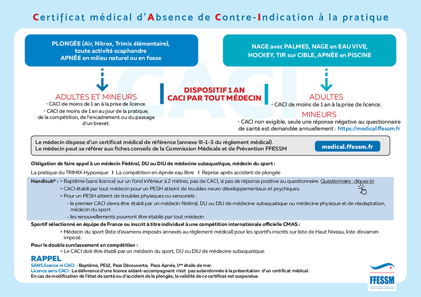 Si ce CACI n’a pas de formalisme imposé, il existe un document support suggéré par la FFESSM, disponible au format pdf en suivant ce lien (Modèle CACI), que vous pourrez présenter à votre médecin au moment de la visite. En complément, si votre médecin n’est pas familier des contraintes spécifiques de nos activités subaquatiques, il vous est possible de lui partager vos réponses au questionnaire préalable d’aide à la réalisation de la visite, suggéré par la FFESSM (Questionnaire médical préalable à la visite médicale).