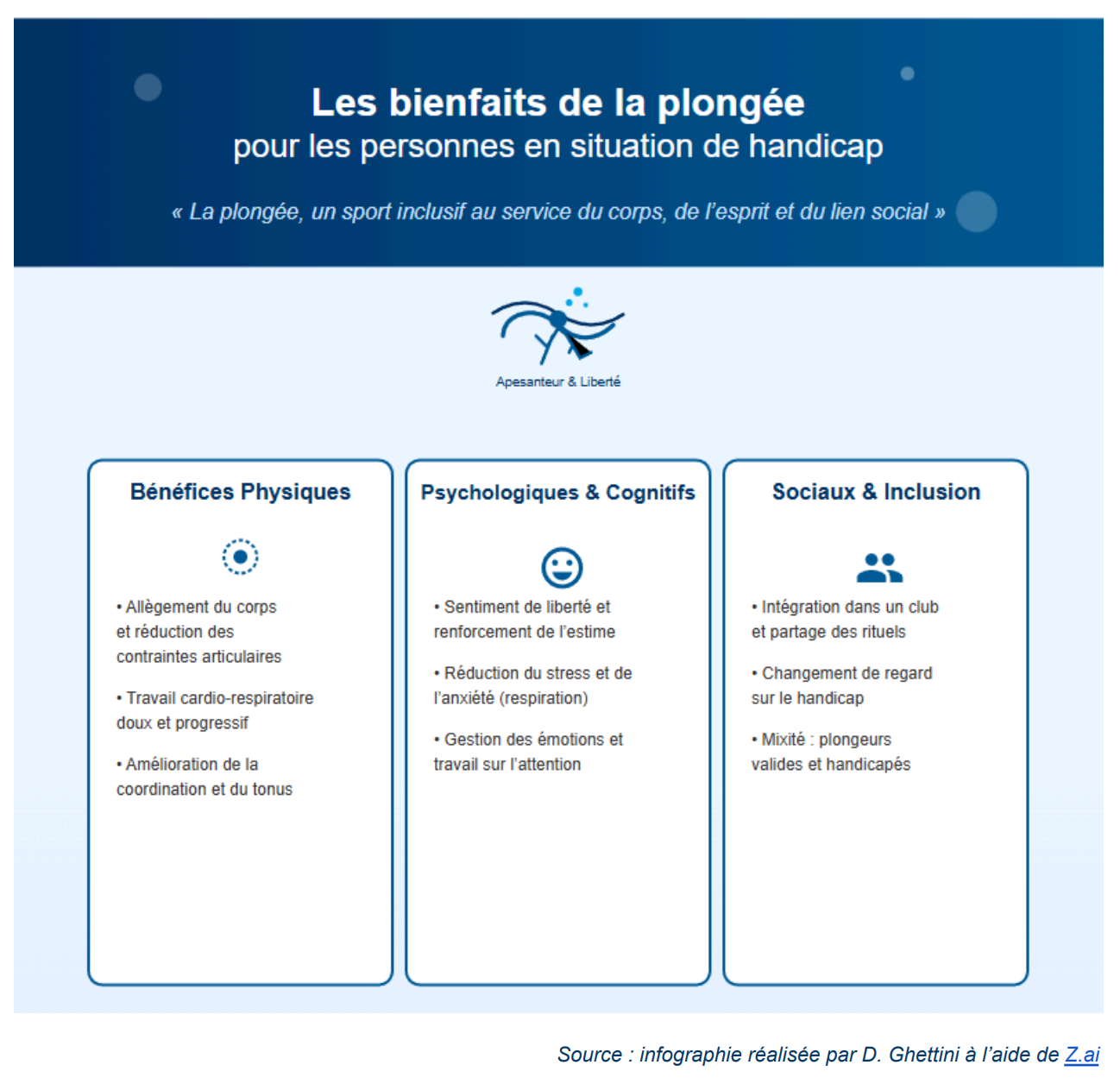 ● Montée en compétences des moniteurs grâce aux qualifications EH1/EH2 et MFEH, transférables ensuite à l’encadrement des plongeurs « valides » (meilleure individualisation, sécurité renforcée, gestion du stress)