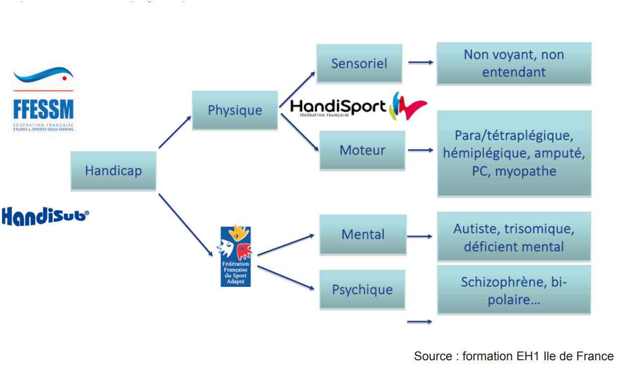 Les activités subaquatiques à des personnes en situation de handicap résultent de formations complémentaires aux diplômes d'encadrement de la FFESSM (initiateurs, entraîneurs ou moniteurs).